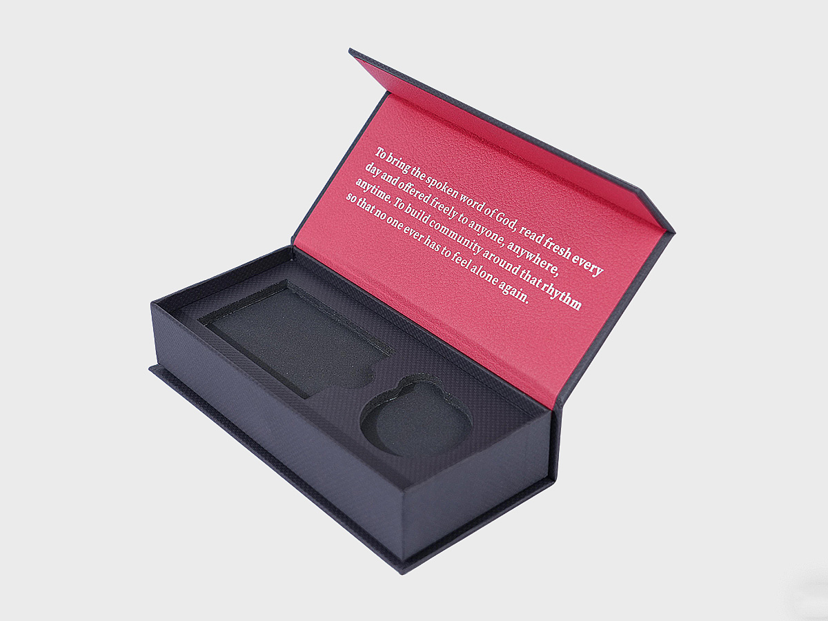 This Book-shaped Hinged box, a top-tier Custom Gift packaging box, features a black embossed Specialty paper outer layer, exquisite silver/white gold Hot stamping, and an EVA insert wrapped in red Specialty paper—blending luxury texture, strong protection, and an elegant unboxing experience for high-end gifts.