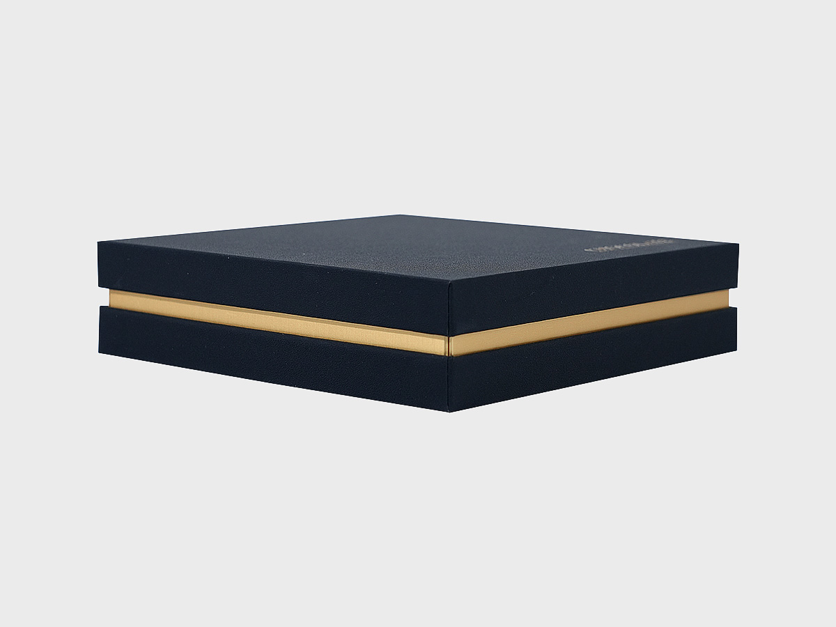 Selected textured black touch paper paired with matt gold card, coated with scratch-resistant matt lamination, combined with flat hot stamping, presenting understated luxury texture, suitable for diverse scenarios of custom chocolate gift boxes.