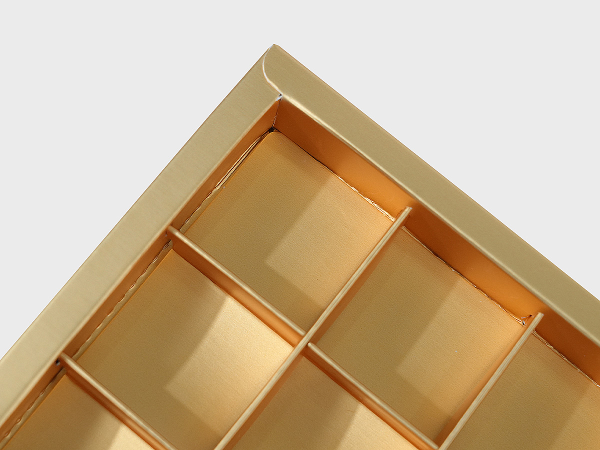 High-temperature embossing on the surface of matt gold card, presenting uniform and shiny metallic luster, enhancing the visual layering of custom printed chocolate boxes.