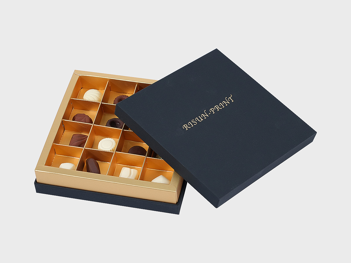 Our custom chocolate box packaging offers wholesale customized chocolate boxes—luxury lid and base design with textured black touch paper, gold foil stamping & scratch-resistant matt lamination. Ideal custom valentines chocolate box and custom chocolate gift box.