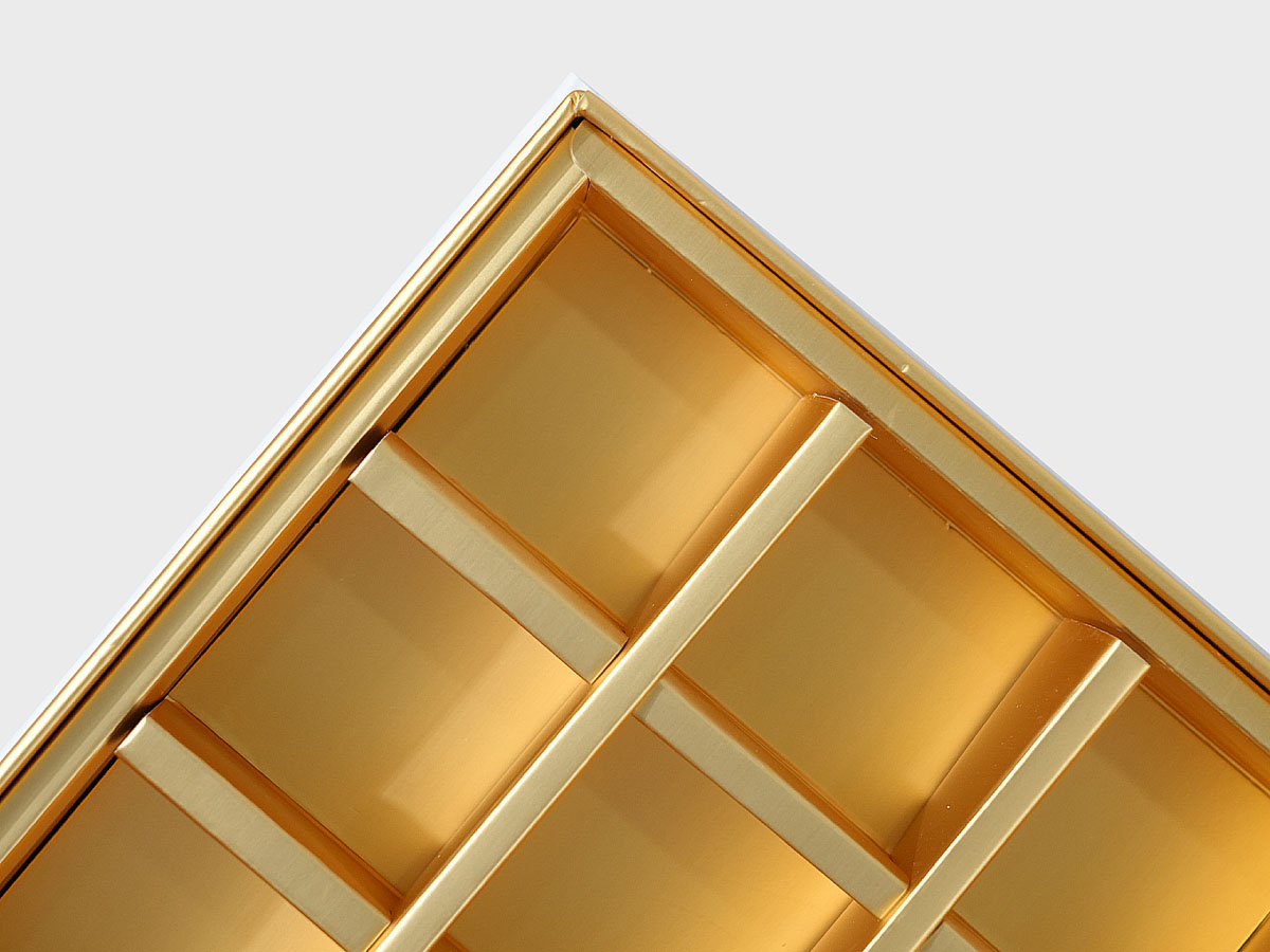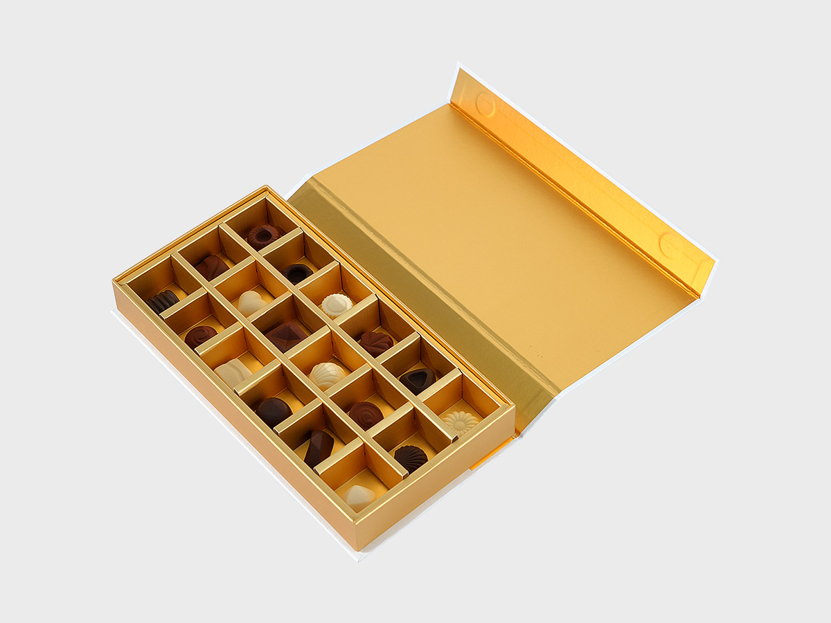 Inner box uses matte gold cardstock mounted on grey board with Matt Lamination, providing a soft touch and effective scratch resistance for customized chocolate boxes.