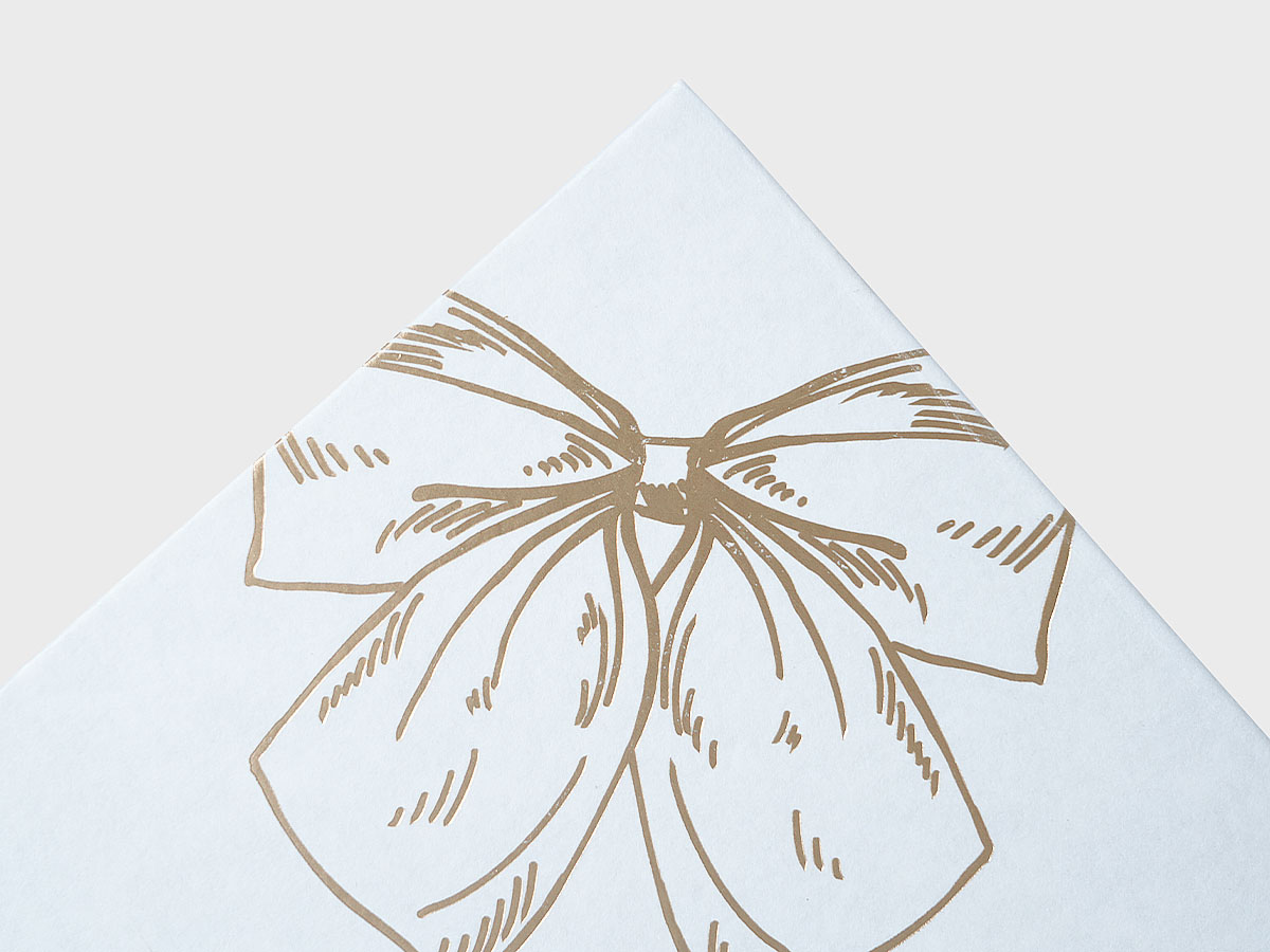Gold stamping craft creates a shiny, durable decorative effect on the white specialty paper surface, enhancing the luxury of custom printed chocolate boxes.