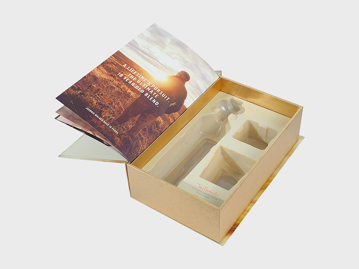 Adopting the classic Book-shaped box structure, the opening and closing method imitates book browsing. Gently opening the outer box reveals the internal whisky, full of ritual sense, adding elegance to the drinking or gifting process. The overall lines of the box type are smooth and the shape is elegant. Whether placed in a wine cabinet for collection and display, or given as a gift to relatives and friends, it can stand out with its unique book-shaped design. According to the size and shape of the whisky bottle, we have accurately adapted the interior of the box type, matching the specified plastic insert (blister insert). The inner insert is customized according to the contour of the wine bottle, which can closely wrap the bottle body, effectively reducing shaking and collision during transportation, providing all-round protection for the wine bottle, and avoiding wear or damage to the bottle body. At the same time, the book-shaped box has excellent sealing performance, which can isolate external dust, moisture and odors, creating a suitable environment for the long-term storage of whisky. It has both display and practicality, and is a preferred box type for wine box Packaging suitable for whisky.