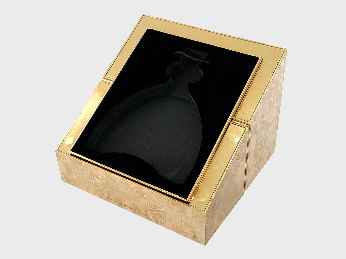 This custom wine box is a hinged whisky wine box made of silver cardstock. With spot color printing, gold stamping & тиснение, EVA flocked insert, it’s an ideal wine bottle gift box for premium gifting.